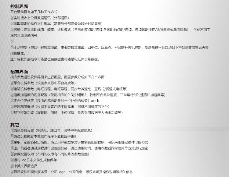 南京全控航空科技有限公司創(chuàng)建于2013年,注冊資金1000萬,占地面積5000平米。是一家集研發(fā)設(shè)計(jì)、生產(chǎn)安裝、銷售服務(wù)為一體的多元化發(fā)展綜合性高科技技術(shù)型企業(yè)。擁有自主品牌商標(biāo)和產(chǎn)品知識(shí)產(chǎn)權(quán),主導(dǎo)產(chǎn)品為:三/六自由度運(yùn)動(dòng)仿真平臺(tái)、賽車/飛行游戲平臺(tái)、地震仿真平臺(tái)、虛擬仿真模擬平臺(tái)、三/六自由度運(yùn)動(dòng)平臺(tái)控制卡、各類自由度平臺(tái)控制系統(tǒng)、控制軟件、標(biāo)定軟件、播放軟件、中控軟件以及同步軟件和VR虛擬設(shè)備等,廣泛應(yīng)用在各種訓(xùn)練,如飛行、艦艇、坦克等的駕駛模擬,以及動(dòng)感電影、娛樂設(shè)備等各特種行業(yè)設(shè)備領(lǐng)域。目前已通過GJB9001C-2017武器裝備質(zhì)量管理體系、GB/T28001-2011/OHSAS18001:2007職業(yè)健康安全管理體系、ISO9001質(zhì)量體系、ISO14001環(huán)境管理體系認(rèn)證和CE產(chǎn)品認(rèn)證,擁有軟著54件、專利32件、軟品8件,并獲得中國質(zhì)量誠信4A級(jí)品牌企業(yè)、江蘇省民營科技企業(yè)、軟件企業(yè)、江蘇省高新技術(shù)后備企業(yè)、南京市2017年度“專精特新”中小企業(yè)、江寧區(qū)“守合同重信用”企業(yè)、江寧區(qū)知識(shí)產(chǎn)權(quán)示范企業(yè)等稱號(hào),其中六自由仿真平臺(tái)被認(rèn)定為江蘇省重點(diǎn)推廣應(yīng)用的新技術(shù)新產(chǎn)品、江蘇省高新技術(shù)產(chǎn)品、南京市新興產(chǎn)業(yè)重點(diǎn)推廣應(yīng)用產(chǎn)品。