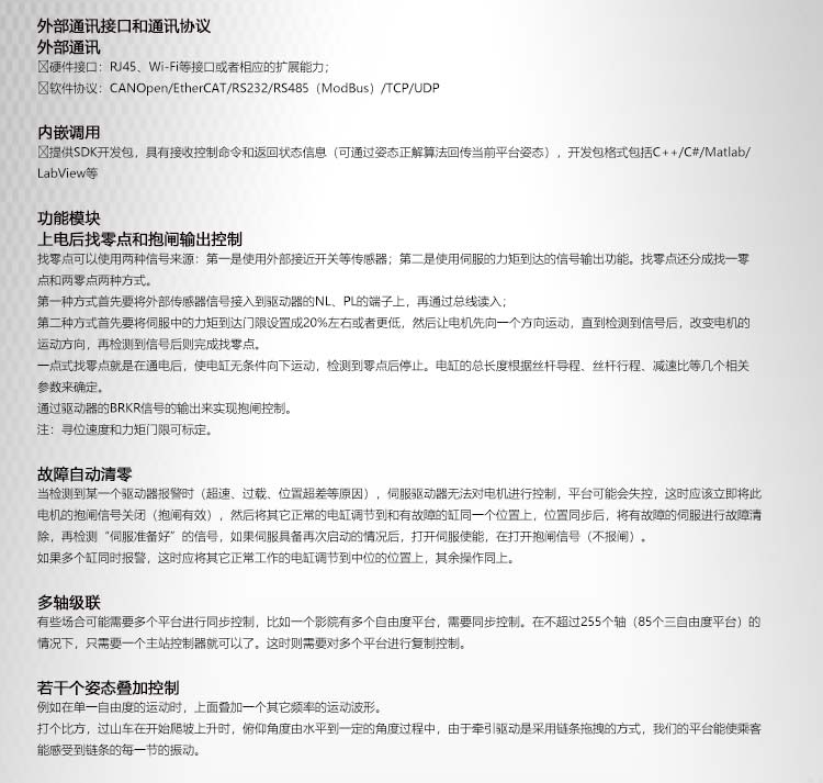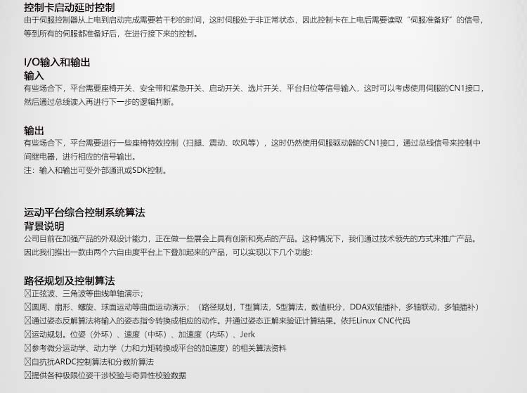 答: 我公司主要從事仿真平臺(tái)、六自由度平臺(tái)和運(yùn)動(dòng)平臺(tái)控制卡的研發(fā)、生產(chǎn)與銷售,同時(shí)承接大型4D/5D/7D影院等工程。專注技術(shù)領(lǐng)先,提升用戶體驗(yàn)是我們的追求!