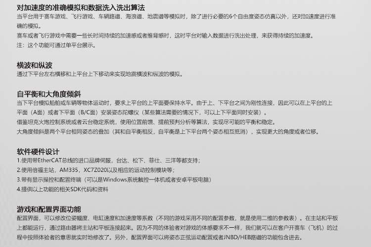 該平臺(tái)為三自由度跑步模擬仿真平臺(tái),由南京全控自主研發(fā),精密設(shè)計(jì),進(jìn)口一線品牌組裝。該平臺(tái)模擬跑步訓(xùn)練,應(yīng)用于科研研究和模擬體驗(yàn),性價(jià)比高,歡迎咨詢了解!