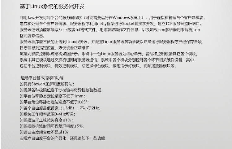 答: 我公司主要從事仿真平臺、六自由度平臺和運動平臺控制卡的研發(fā)、生產(chǎn)與銷售,同時承接大型4D/5D/7D影院等工程。專注技術(shù)領(lǐng)先,提升用戶體驗是我們的追求!
