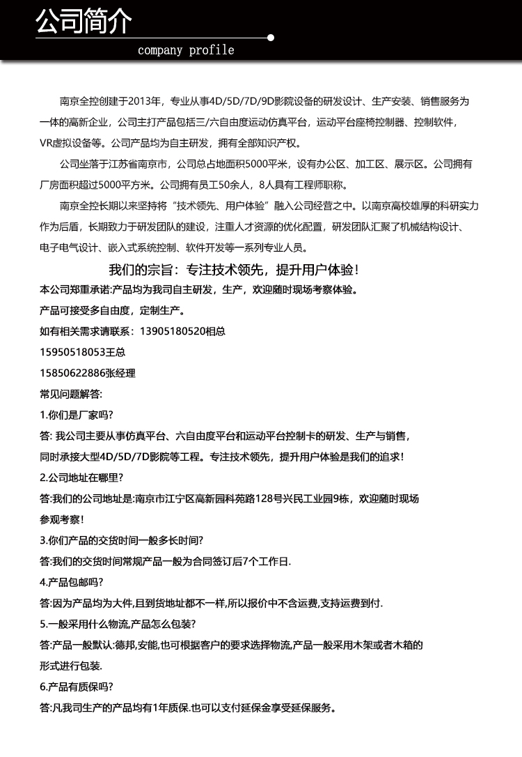 在艦艇仿真這一領(lǐng)域,南京全控航空科技有限公司是國(guó)內(nèi)首屈一指的行業(yè)專(zhuān)家,專(zhuān)業(yè)從事三/六自由度運(yùn)動(dòng)仿真平臺(tái)的開(kāi)發(fā),賽車(chē)/飛行游戲平臺(tái)、地震仿真平臺(tái)等。旗下的六自由度運(yùn)動(dòng)平臺(tái)是由六支電動(dòng)缸,上、下各六只萬(wàn)向鉸鏈和上、下兩個(gè)平臺(tái)組成,下平臺(tái)固定在基礎(chǔ)上,借助六支電動(dòng)缸的伸縮運(yùn)動(dòng),完成上平臺(tái)在空間六個(gè)自由度的運(yùn)動(dòng),從而可以模擬出各種空間運(yùn)動(dòng)姿態(tài)。六自由度運(yùn)動(dòng)平臺(tái)涉及到機(jī)械、液壓、電氣、控制、計(jì)算機(jī)、傳感器,空間運(yùn)動(dòng)數(shù)學(xué)模型、實(shí)時(shí)信號(hào)傳輸處理等一系列高科技領(lǐng)域,因此六自由度運(yùn)動(dòng)平臺(tái)是控制領(lǐng)域水平的標(biāo)志性象征。主要包括平臺(tái)的空間運(yùn)動(dòng)機(jī)構(gòu)、空間運(yùn)動(dòng)模型、液壓系統(tǒng)、控制系統(tǒng)??蓮V泛應(yīng)用到各種訓(xùn)練模擬器,如艦艇模擬器等。