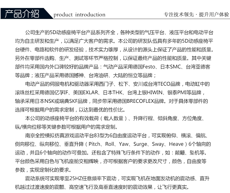 公司生產(chǎn)的 5D 動感座椅平臺產(chǎn)品系列齊全,各種類型的氣壓平臺、液壓平臺和電動平臺均為自主研發(fā)和生產(chǎn),以滿足廣大客戶的需求。本公司的研發(fā)隊(duì)伍具有多年的5D 動感座椅平臺硬件、電路和軟件的研發(fā)經(jīng)驗(yàn),技術(shù)實(shí)力雄厚,從設(shè)計(jì)的源頭上保證了產(chǎn)品的性能和質(zhì)量。另外在零部件選購、生產(chǎn)、測試等環(huán)節(jié)嚴(yán)格控制,以保證最終產(chǎn)品的性能和質(zhì)量。其中關(guān)鍵部件均采用國內(nèi)外口碑較好的品牌產(chǎn)品: