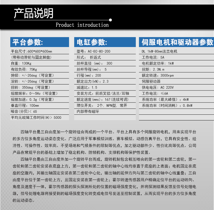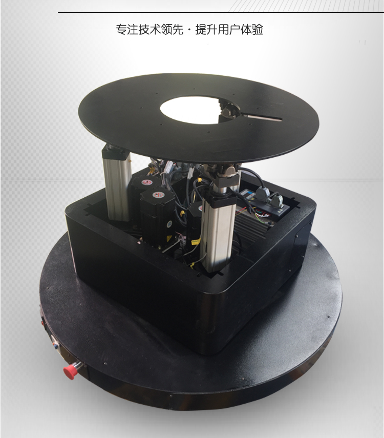 四軸平臺是三自由度加一個旋轉組合而成的一個平臺。平臺上具有多個伺服旋轉電機,用來實現(xiàn)平臺的多方位多角度運動姿態(tài)變化。廣泛應用于軍事模擬訓練、賽車模擬、動感仿真平臺,它具有安全性、經(jīng)濟性、可操作性、效率高、不受場地和氣候條件的限制等優(yōu)點,加之驅動部件少、性價比高等優(yōu)點。公司產(chǎn)品在常規(guī)平臺的基礎上增加了穩(wěn)定機構、防傾機構、支撐機構等保護性裝置。