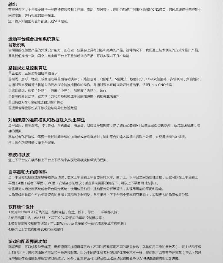 答: 我公司主要從事仿真平臺、六自由度平臺和運動平臺控制卡的研發(fā)、生產(chǎn)與銷售,同時承接大型4D/5D/7D影院等工程。專注技術(shù)領(lǐng)先,提升用戶體驗是我們的追求!