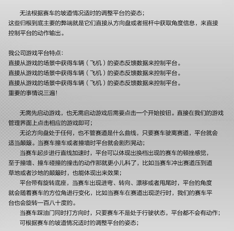 采用國(guó)際領(lǐng)先動(dòng)感控制技術(shù),使用電動(dòng)缸六自由度動(dòng)感平臺(tái),真正做到與游戲緊密結(jié)合,可以完成俯沖、爬升、傾斜、拐彎、旋轉(zhuǎn)、下墜、顛簸等高難度的驚險(xiǎn)刺激動(dòng)作,從動(dòng)感、駕駛操控、影音、仿真方面給予用戶超真實(shí)的體驗(yàn)。具有極高趣味性,新穎性,刺激性,震撼性,娛樂性,科普性, 可達(dá)到大量、快速吸引客戶眼球和超高級(jí)娛樂體驗(yàn)的效果。