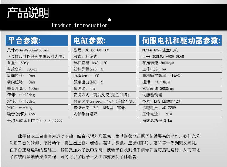 關(guān)鍵詞: 三自由度平臺(tái),電動(dòng)仿真平臺(tái),花轎模擬仿真體驗(yàn)平