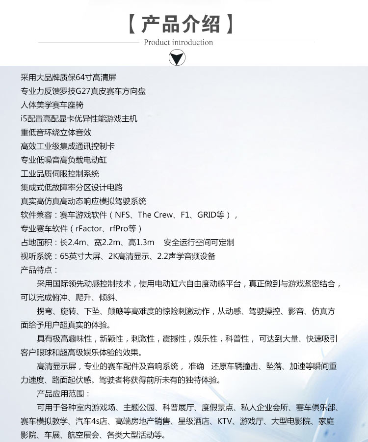 高清顯示屏,專業(yè)的賽車配件及音響系統(tǒng), 準(zhǔn)確 還原車輛撞擊、墜落、加速等瞬間重力速度、路面起伏感。駕駛者將獲得前所未有的獨(dú)特體驗(yàn)。