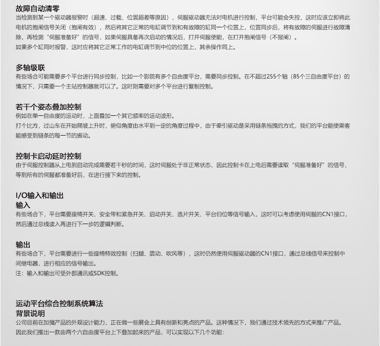 答: 我公司主要從事仿真平臺、六自由度平臺和運動平臺控制卡的研發(fā)、生產(chǎn)與銷售,同時承接大型4D/5D/7D影院等工程。專注技術(shù)領(lǐng)先,提升用戶體驗是我們的追求!