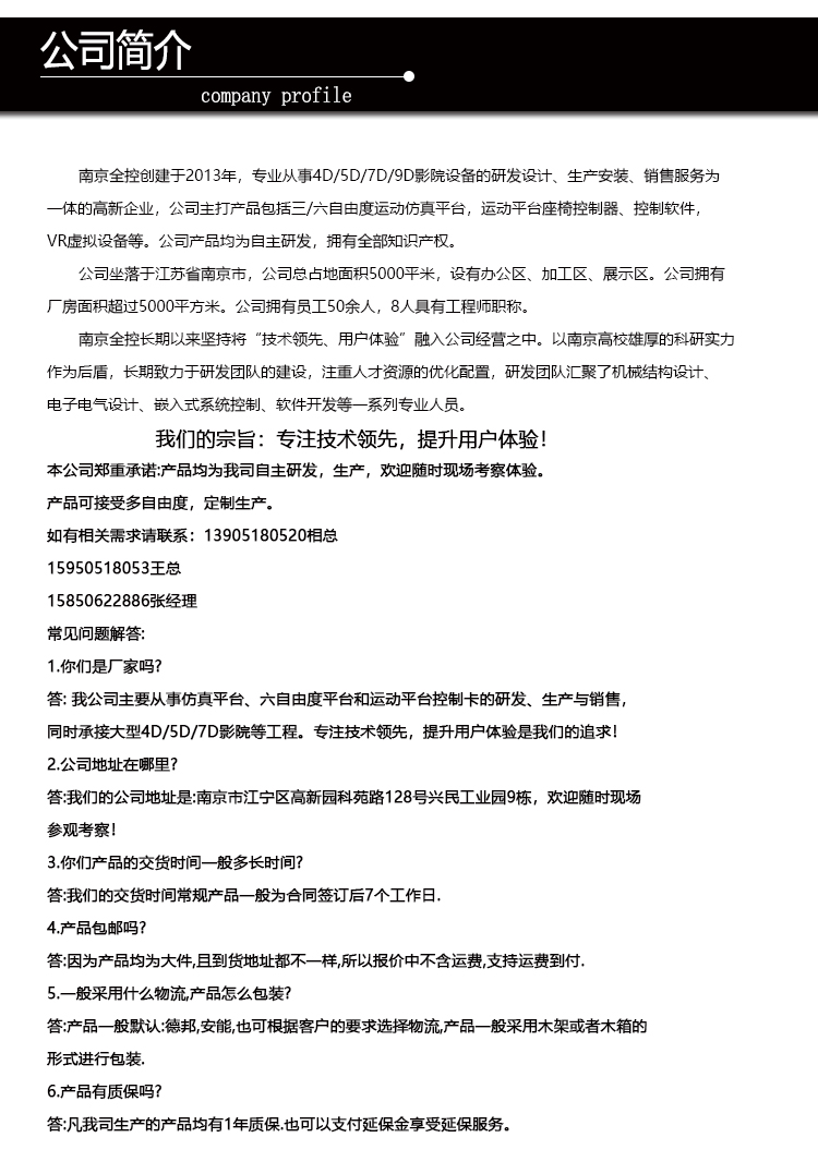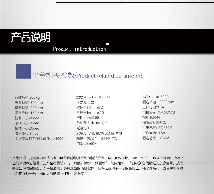 該平臺是南京全控自主研發(fā)的六自由度飛行模擬仿真平臺,該平臺具有高控制精度和高控制穩(wěn)定性,南京全控的平臺在經(jīng)過模擬反復(fù)測試的情況后在進(jìn)行真實測試也能提升訓(xùn)練和測試的安全性,憑借這些優(yōu)勢已經(jīng)成為越來越多科研院所和飛行訓(xùn)練的青睞。