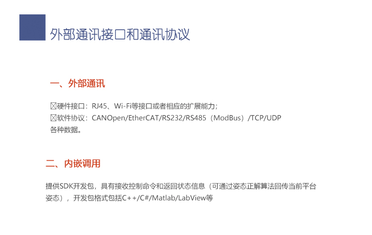 l 提供SDK開發(fā)包,具有接收控制命令和返回狀態(tài)信息(可通過姿態(tài)正解算法回傳當(dāng)前平臺姿態(tài)),開發(fā)包格式包括C++/C#/Matlab/LabView等