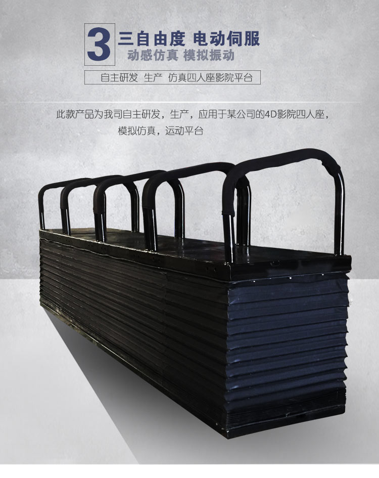 4D動(dòng)感座椅是建立4D動(dòng)感影院必不可少的構(gòu)成元素之一,4D動(dòng)感座椅可以根據(jù)4D動(dòng)感影院中特效座椅的布置故事情節(jié)的不同而由計(jì)算機(jī)控制做出不同的特技效果來(lái),例如,墜落,震蕩,噴風(fēng),噴雨等等,再配上精心設(shè)計(jì)出來(lái)的煙霧、雨、光電、氣泡、氣味等,從而營(yíng)造一種與影片內(nèi)容相一致的全感知環(huán)境。