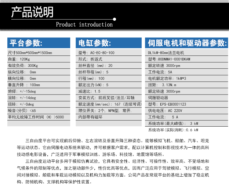 三自由度運動平臺多用于模擬仿真試驗,它具有安全性、經(jīng)濟性、可操作性、效率高、不受場地和氣候條件的限制等優(yōu)點,加之驅動部件少,性價比高等優(yōu)點,因而廣泛應用于駕駛模擬、飛行模擬、空間對接模擬、船載和車載運動模擬以及機構力加載等方面。公司產(chǎn)品在常規(guī)平臺的基礎上增加了穩(wěn)定機構、防傾機構、支撐機構等保護性裝置。