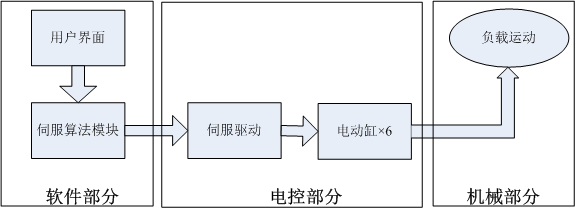 六自由度運動平臺系統(tǒng)由測試軟件部分系統(tǒng)、電氣控制系統(tǒng)、動力電源系統(tǒng)、運動平臺機(jī)械本體組成。運動平臺部分的組成結(jié)構(gòu)示意圖如圖3.1所示。