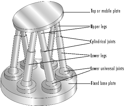 該平臺(tái)有多種變體,但大多數(shù)都有六個(gè)線性致動(dòng)的支腿,支腿平臺(tái)連接的組合有所不同。完整的組件是一個(gè)并聯(lián)的機(jī)器人系統(tǒng),由連接到固定底板的剛體頂部或移動(dòng)板組成。頂板的中心至少由三個(gè)坐標(biāo)定義,目的是在3D空間中移動(dòng)該中心點(diǎn)。