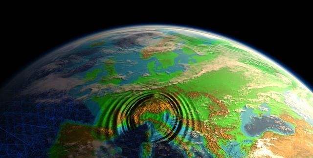 畫(huà)面為震源到地表的剖面圖,模擬地震波從震源到地表的傳遞的過(guò)程,紅色代表縱波、綠色代表橫波;根據(jù)橫波和縱波的傳播速度和時(shí)間...
