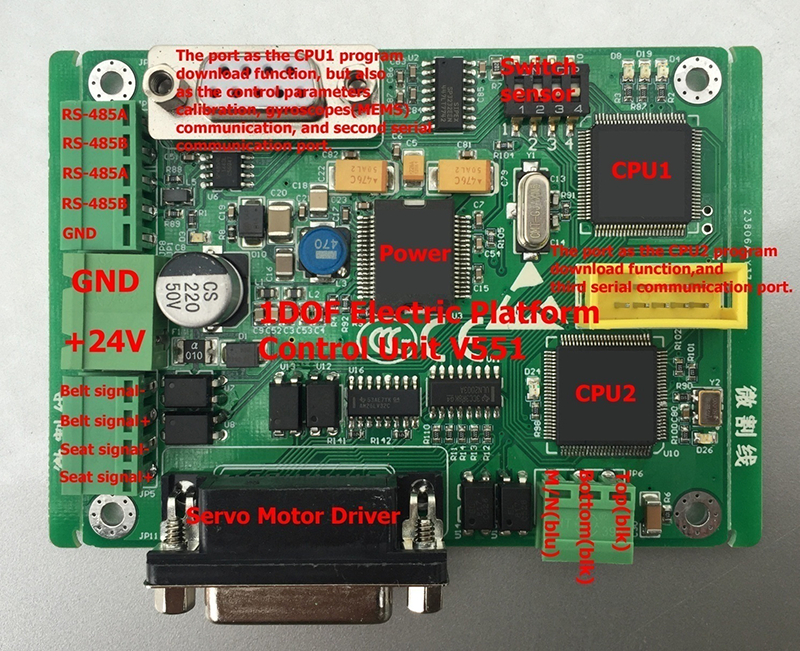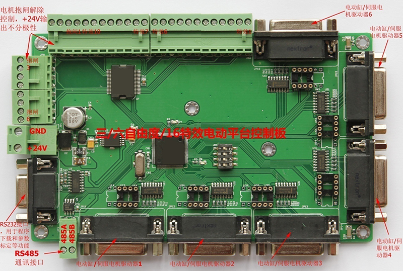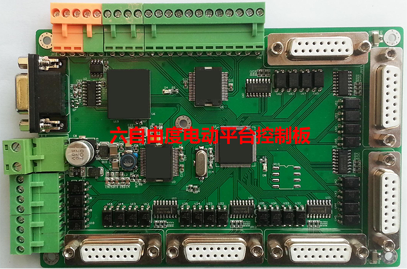 板上的6個驅動器的接口為DB15(雙排)孔座;標定接口為DB9孔座;電源輸入接口為EDG7.62-2彎腳帶封邊針座;5D動感影院座椅信號控制板V520版本,于2013年10月份生產(chǎn),是一款專門為了電動平臺定制的控制器,可支持西門子、安川、松下、三菱、臺達、東元、華大、四通等市面主流伺服系統(tǒng)。