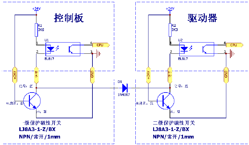 2. 在一級保護(hù)電路的基礎(chǔ)上,又增加了一級驅(qū)動器的被動保護(hù) (正反轉(zhuǎn)禁止),其下和上的安裝大致處于5%和95%的位置,又稱為二級保護(hù)。