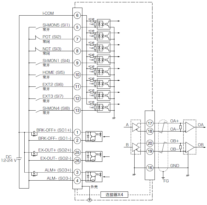 注: A6B驅(qū)動器內(nèi)部不提供+24V電源,需將驅(qū)動器的6腳接+24V外部電源正極,同時再將2, 4, 26三個管腳都連接到外部電源負(fù)極。