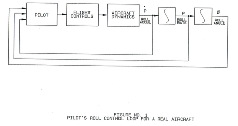 并且可以采用分析方法來準(zhǔn)確了解就飛行員而言運動基座在做什么。圖1顯示了實際飛機的飛行員側(cè)傾控制回路的框圖。飛行員從飛機上得到提示,告訴他飛機在做什么。側(cè)傾加速度和速度提示是“褲子座位”中的主要提示,而側(cè)傾角度提示則完全可見。誠然,飛行員可以從窗外看到一些速度提示,但是在瞬態(tài)條件下,飛行員很難,因為他必須通過心理上的區(qū)分來得出速度。飛行員無法通過向窗外看來獲得加速度提示。