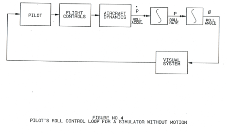 圖4顯示了沒有運動的模擬器飛行員的側(cè)傾控制環(huán)。請注意,完全沒有加速度反饋,并且必須通過將滾動位置與視覺顯示區(qū)分開來得出任何速率信息。從分析上可以看出,除非飛行員大幅度改變其補償(即他使用提示來控制飛機的方式),否則側(cè)傾控制回路將變得不穩(wěn)定。此外,飛行員在運動時的陣風(fēng)反應(yīng)與運動時的陣風(fēng)反應(yīng)完全不同。